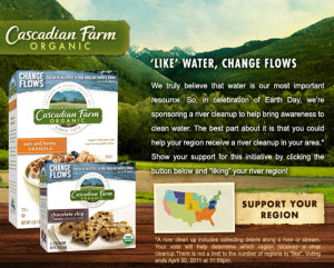 Now, through April 30th, you can help make “Change Flow” by visiting Cascadian Farm and “liking” the U.S. Region you think is most deserving of a river clean-up. The region with the most “likes” will receive a river clean-up and Cascadian Farm is contributing $50,000 to American Rivers, a non-profit organization committed to restoring and preserving our country’s water sources.