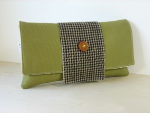 Today’s Earth friendly Etsy Shop is b. bags in Houston, Texas. b. bags is owned by Lora Bunge who has been sewing clutches, wallets, messenger and tote bags for over two years. The first thing you will notice while browsing b. bags is the fantastic colors, patterns and shapes. I love the Betsy Over sized Clutch in Green and Brown Hounds Tooth Wool and the Benson in Gold and Brown (The lining is fabulous). Lora’s favorite materials to use are second hand and vintage, of course. She loves wools, linens, thick durable denims and canvas. She is inspired by her drive to become more creative, she finds that spending the day at the thrift store turns on the designer inside of her. She can look at a pair or pants and think of ways that she could incorporate it’s material into a new lovely handbag. The best part of b.bags is that Lora uses every piece of scrap material, nothing is wasted.