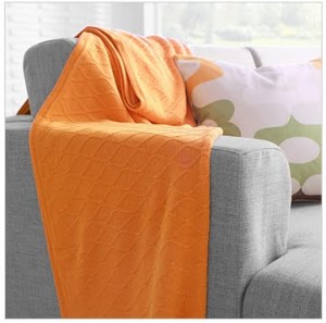 I recently received a fab Inhabit Living Sunshine organic cotton/bamboo blend throw and it has become the go to throw in our home. It seems like everyone is always fighting over it. Once in a while, Jayson will get home early from work before anyone else and I will find him snoozing on the sofa wrapped up in it. At snuggle reading time each night, Eben races me to the sofa, in hopes that he will reach the throw first. And I personally, one day last week, stayed snuggled up in the throw all day long. I think the reason that this throw is such a hit (besides the fact that it is organic) is because for one, it is huge, 60×84 to be exact, so it is the perfect size for adults. It is comfy, and made with a smart Oeko-Tex® Certified 80% bamboo/20% organic cotton fabric blend, which makes the throw super soft and cuddly, and last but not least, it is beautiful. It is a fabulous orange {sunshine} color, which by the way is my favorite color and has a knitted design that is elegant. I also love that it gives my living room a splash of fun color.