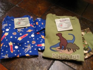 We visited our Costco Saturday night to pick up a few essentials and to see if they had organic turkeys for Thanksgiving. They do, Yay! While we were there, the mister suggested that we look for pajamas for Eben. I usually buy him pajamas for the holidays, but he is in desperate need of warm pajamas, since his no longer fit and I don’t think he could wait much longer. I wasn’t sure, if we would find anything Eco friendly in the pajama section at Costco. However, what to my wandering eyes should appear, but Children’s 100% SKAL Certified Organic Cotton Pajamas. Even the tags were 100% recycled paperboard, printed with soy ink. I was a little stunned and overjoyed. They were a great deal at $11.99 for a 2 piece set and they had sweet designs perfect for any little boy or girl. Eben picked the space and dinosaur pajamas.