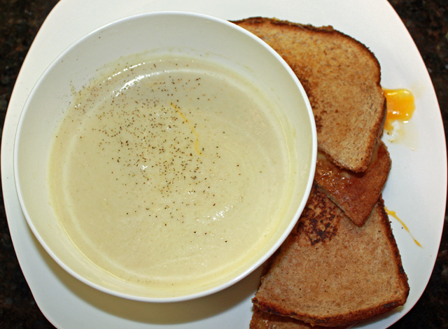 Chop the cauliflower, onion and garlic. In a saucepan heat the olive oil over medium heat, add the garlic and onion. Cook until soft about 5 minutes. Add the cauliflower, vegetable stock and bring to a boil. Reduce the heat and simmer until the cauliflower is very soft, about 15 minutes. Remove from heat and using a handheld immersion blender, puree the soup. Of course, you could add larger chunks of carrots, potatoes and celery too! Eben likes his served with a gluten-free grilled cheese sandwich. Serves 6.