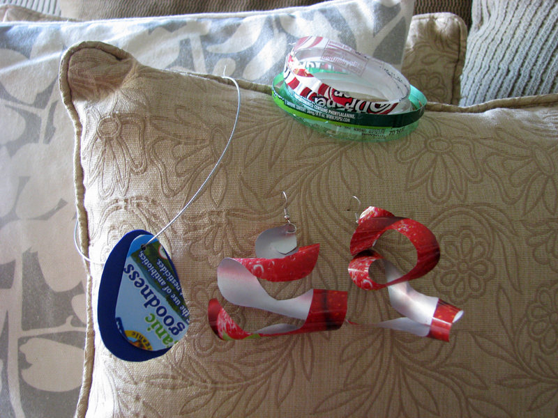 Even though its fun for dress up, much of children’s jewelry contains lead and cadmium — which are neither fun or beautiful. However, kids don’t need store-bought jewels to feel fancy? You can make simple, safe kids jewelry to using found objects lurking around your home and in the recycling bin. From bracelets, to necklaces to dangling earrings, you can help your child make unique jewelry that’s age-appropriate and free of toxic metals. Read on to see how you can make a bracelet, necklace and pair of earrings in any size or shape that you wish. Since adult-only tools and skill are required for this recycled kids jewelry how to, you may want to appoint your child the jewelry designer and you can be the jewelry crafter. And the best part, if they ruin or lose a piece, it doesn’t matter! Eben and I had a blast making this jewelry – his favorite part was seeing me model the pieces so he could take the pictures. Hilarious! Check out the pieces that we created and leave your comments to let me know what you thought.