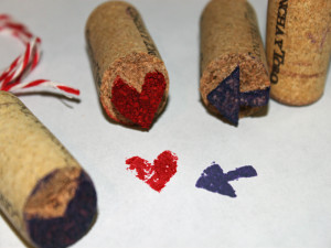 Every time we celebrate an occasion with a bottle of wine, I toss the leftover cork in a large jar in our kitchen, before recycling the bottle. Over the years, we have amassed a nice little collection — and since cork is so versatile, I use it frequently in different projects. Most recently, Eben and I carved a little set of recycled wine bottle cork stamps to give to a friend. My son is older, so he was able to do the carving of the designs into the corks himself. However, if you have little ones, you will want to do the carving, and reserve all of the stamping for them.