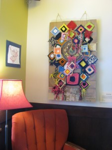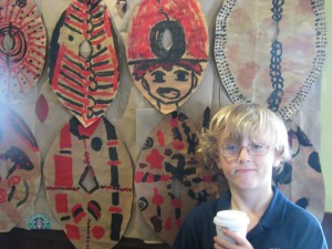 We went to the opening reception of Kids. Culture. Coffee – an art exhibit at our local Starbucks. Eben had a handful of pieces in the exhibit – all with a focus on the art and culture of the Mexican and African coffee lands. Each of the pieces was made using recyclable Starbucks packaging. The best part – when we arrived, Eben was showing me all of his different pieces, what they were made of and what meaning they held. When we came upon his drum (up high on a shelf), he exclaimed, ” Oh no! It is upside down and backwards!” A Starbucks employee quickly sprang into action, grabbing a step ladder and repositioning the drum exactly to Eben’s specifications. Talk about customer service! Here are some photos of the exhibit: