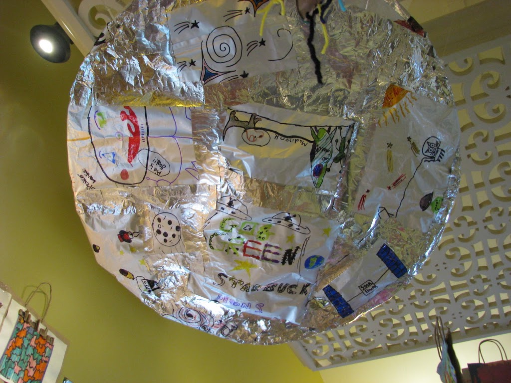 We went to the opening reception of Kids. Culture. Coffee – an art exhibit at our local Starbucks. Eben had a handful of pieces in the exhibit – all with a focus on the art and culture of the Mexican and African coffee lands. Each of the pieces was made using recyclable Starbucks packaging. The best part – when we arrived, Eben was showing me all of his different pieces, what they were made of and what meaning they held. When we came upon his drum (up high on a shelf), he exclaimed, ” Oh no! It is upside down and backwards!” A Starbucks employee quickly sprang into action, grabbing a step ladder and repositioning the drum exactly to Eben’s specifications. Talk about customer service! Here are some photos of the exhibit: