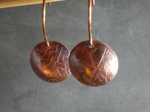 Giveaway number ten is a lovely pair of antiqued copper earrings made from remnants that were headed for the trash. These lovely little earrings are etched, cut and antiqued by a family of four Tracy, Matt, Emily and Matthew Prince from Stepping Stones Etsy Shop. Each family member at Stepping Stones brings creative and humor to the shop. I love, love, love this. Wouldn’t it be wonderful to work everyday with your entire family? Another lovely feature, they are also member’s of Team Eco Etsy.