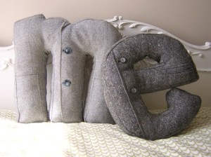 Giveaway number five is a lovely, lovely custom alphabet pillow from Hilary Cosgrove. Hilary’s pillows are made from fabulous recycled suit jackets. She does a fantastic job of searching out and finding the most lovely and unique suit jackets, some will have buttons, some will have a pocket. You will also find retro awesome tweeds, herringbones and checks in her collection of fabrics to choose from. Either way, you will get a fabulous pillow that will be cherished for generations to come. Since Hilary has tons of suit fabrics to choose from in an array of colors and fabrics, you will have a hard time deciding on a fabric. Once you do, Hilary makes all of her lovely pillows by hand and can make all letters. Wouldn’t it be perfect to give someone their initials as a holiday gift this year? I can picture these pillows adorning my sofa, bed, overstuffed and wooden chairs, can’t you?