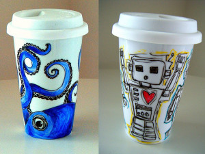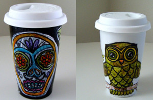 Most of ours are simple – not like these brightly painted, fun, eco-friendly painted ceramic travel mugs from sew Zinski. They made me smile. I bet you wouldn’t forget your reusable mug if it looked like these + Sara, the designer uses toxic free paints.