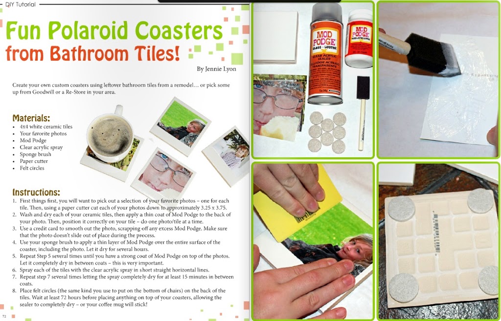 Hello, Friends. I am excited to share that my DIY tutorial for Polaroid Coasters was featured in the Winter 2013 edition of Green Child Magazine! (It’s on page 72-73). Yay!