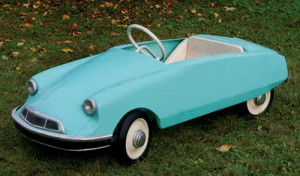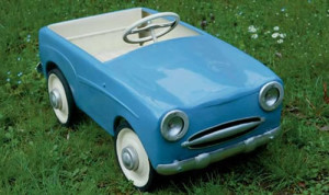 I love, love, love vintage cars. Do you remember this about me? My Dad is a HUGE vintage car lover and has a shop at his home that is full of vintage cars and their parts, around 30 in total. His love for ‘old cars’ definitely rubbed off on me. I also love fantastic kids design that is full of color and gets the imagination rolling. So when the two meet in the fashion of Vintage Pedal Cars from the 1950’s, I start to think to myself, ‘If I start to collect these, where will I put them?’ Aren’t they fantastic? The colors, the shapes. Now, how to tell Mr. Sweet Greens I want to start collecting something this size?